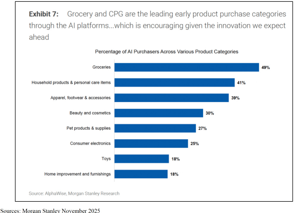 Due to demographics and Google’s category-by-category decline in clicks plus the Agentic Commerce engines categorical focus, we see the following categories that were highlighted in the Morgan Stanley November 25 AlphaWise survey reveal the leaders and laggards in Agentic Commerce: