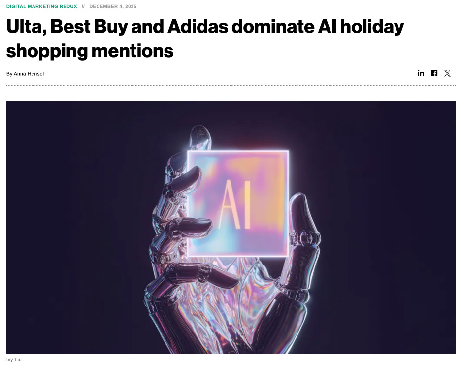 Finally, we’re back to….beauty. Ulta made ripples in Agentic Commerce in Holiday 25 when their GEO mentions rocketed ahead of Sephora and Amazon (self inflicted damage there).