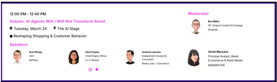 In fact at ShopTalk Spring on Tuesday March 24th, Ekta and I are on the “Pro Agentic Commerce” side of a debate vs. Andrew Lipsman and Sarah Marzano representing the “AI Will Not Transform Retail” side (aka the Naysayers) - come watch us duel it out!