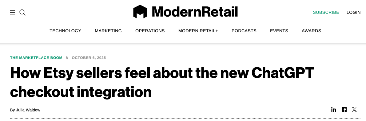 ModernRetail had an interesting piece here where the interviewed a handful of Etsy sellers to get their thoughts on the ChatGPT checkout.