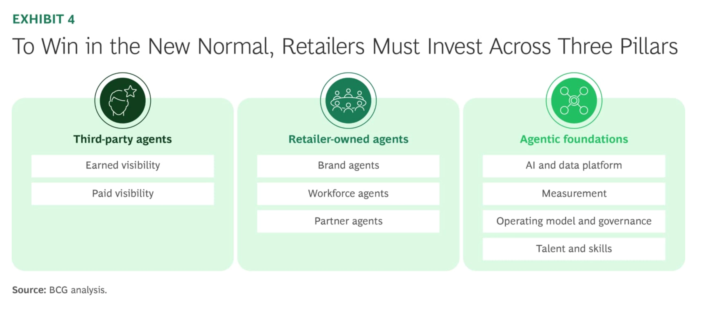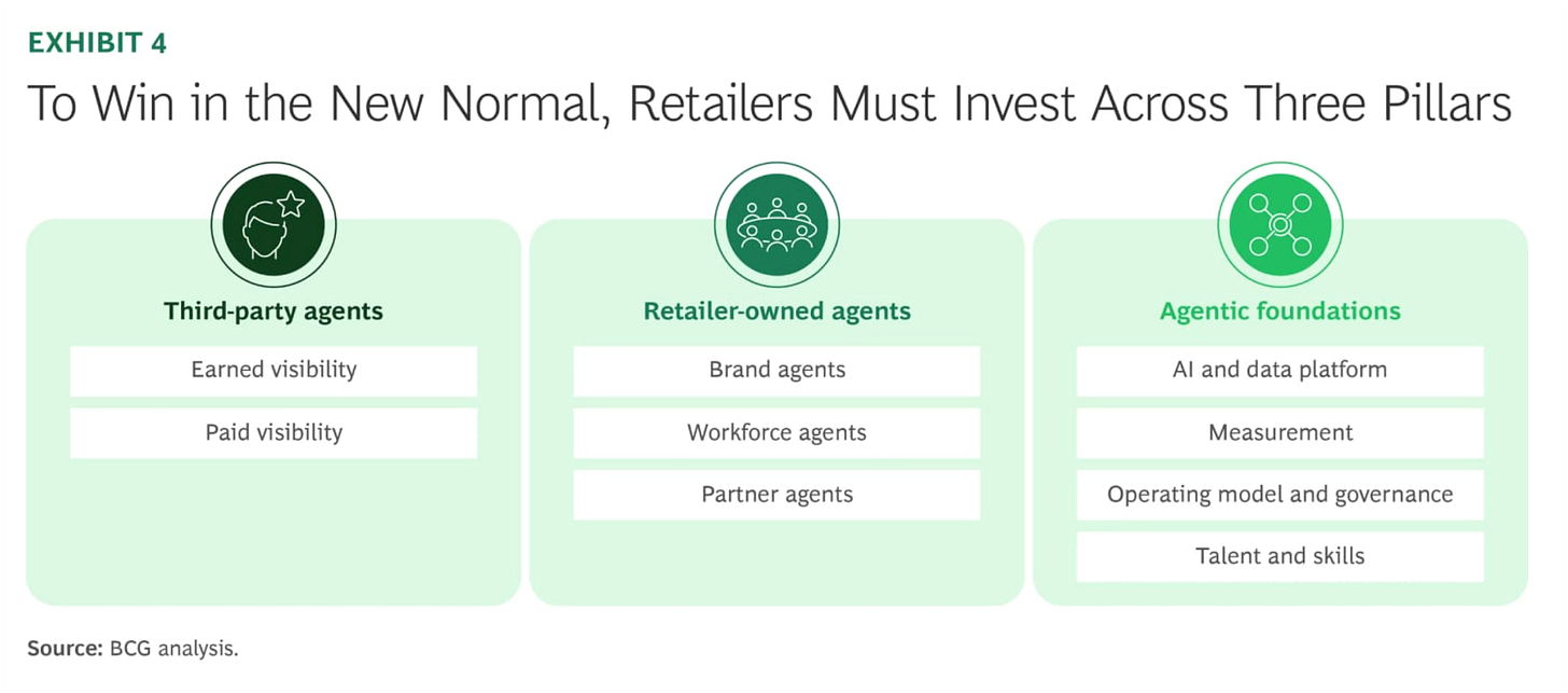 Once they tee-up that Agentic Commerce is big and going to have some pretty big negative impacts if you don’t do something, BCG introduces a classic three pillar diagram:
