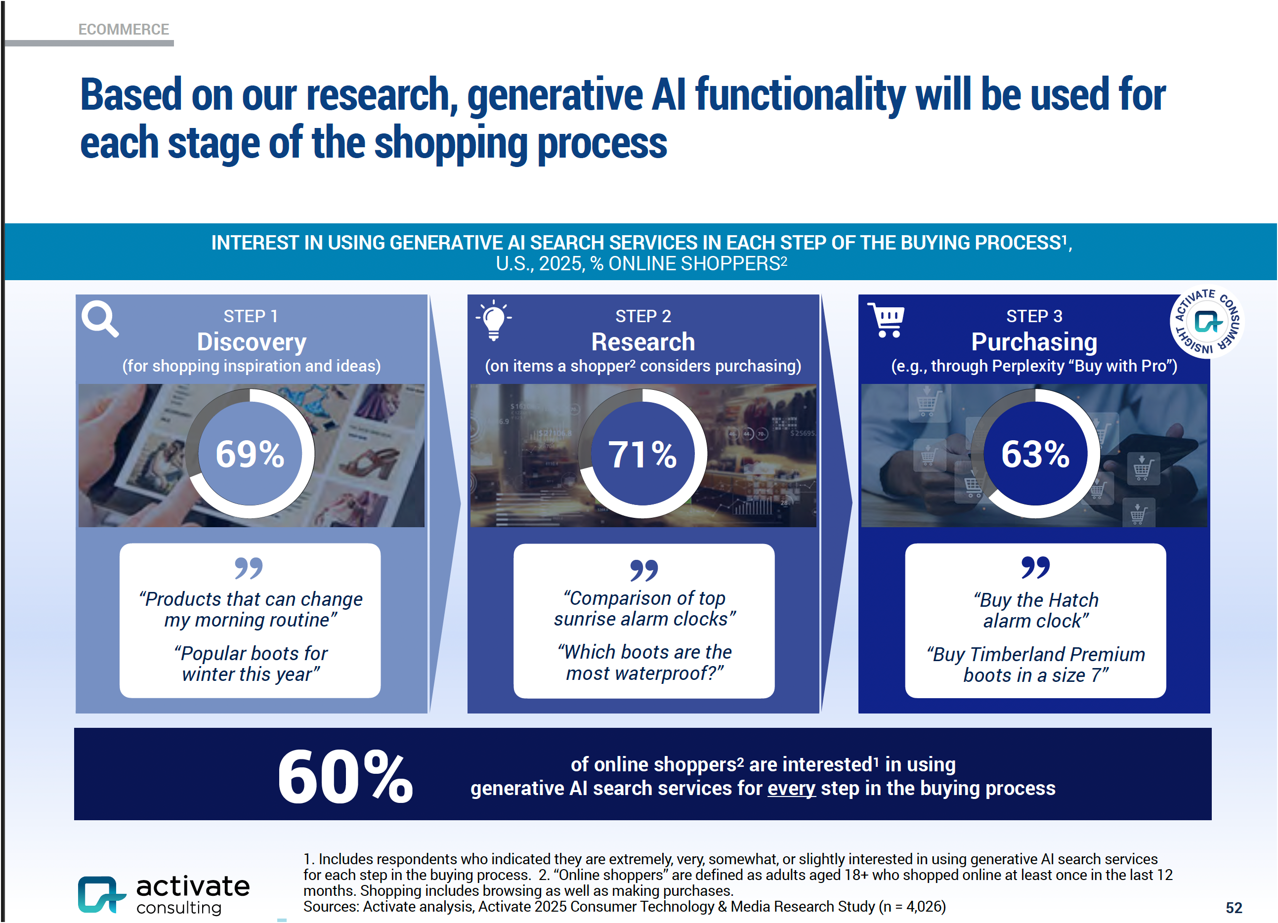 Slide 52: Based on our research, GenAI functionality will be used for each stage of the shopping process