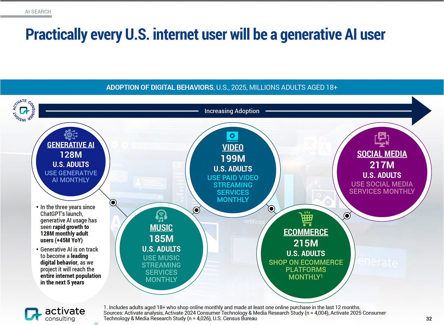 Activate Survey data. Two things about this. I like that it compares the current audience for GenAI which is only 3yrs old to Music, Video, social media and ecommerce. Itās not quite in the the zone with all of these but if it grows another 50% y/y it will be right there.