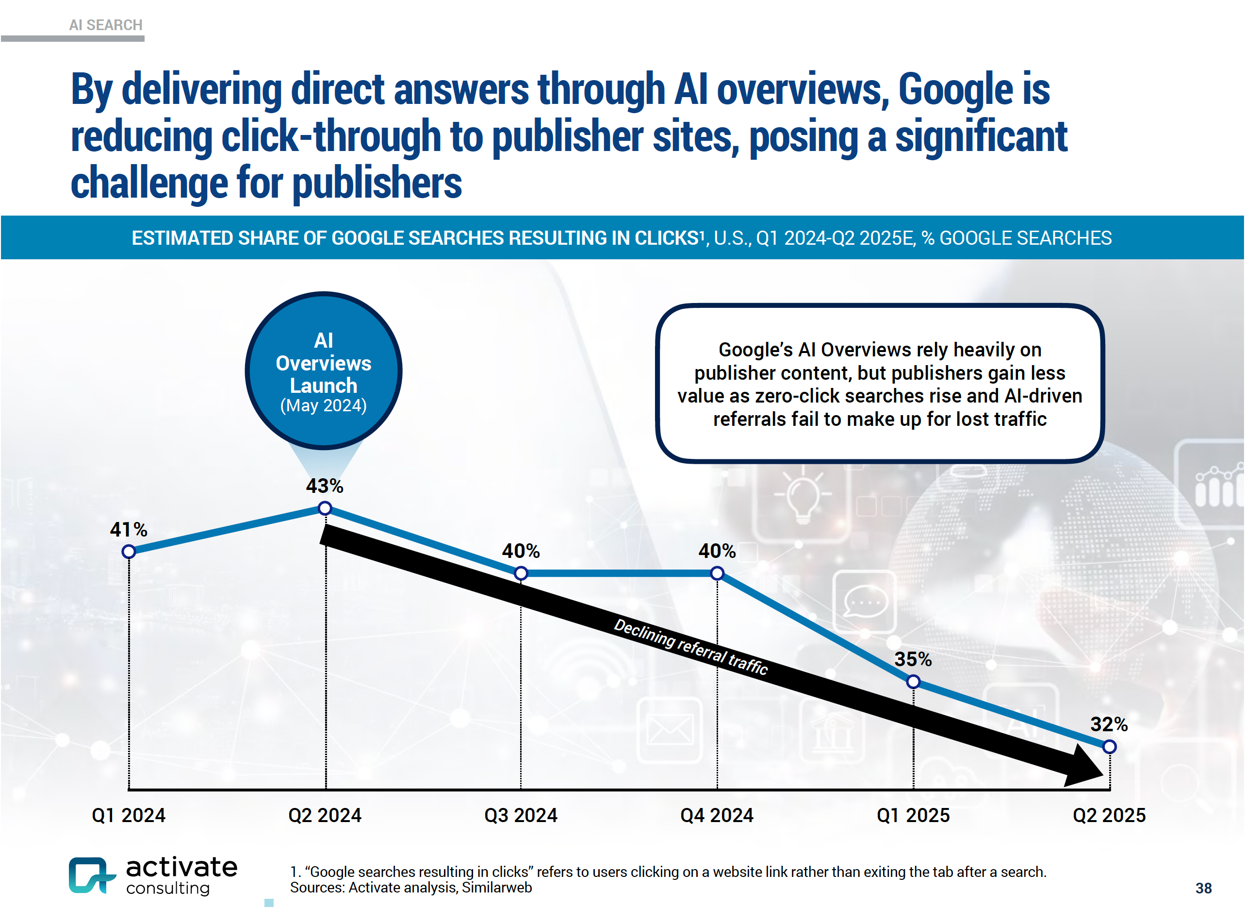Slide 38: By delivering direct answers through AIO, Google is reducing click-through to sites