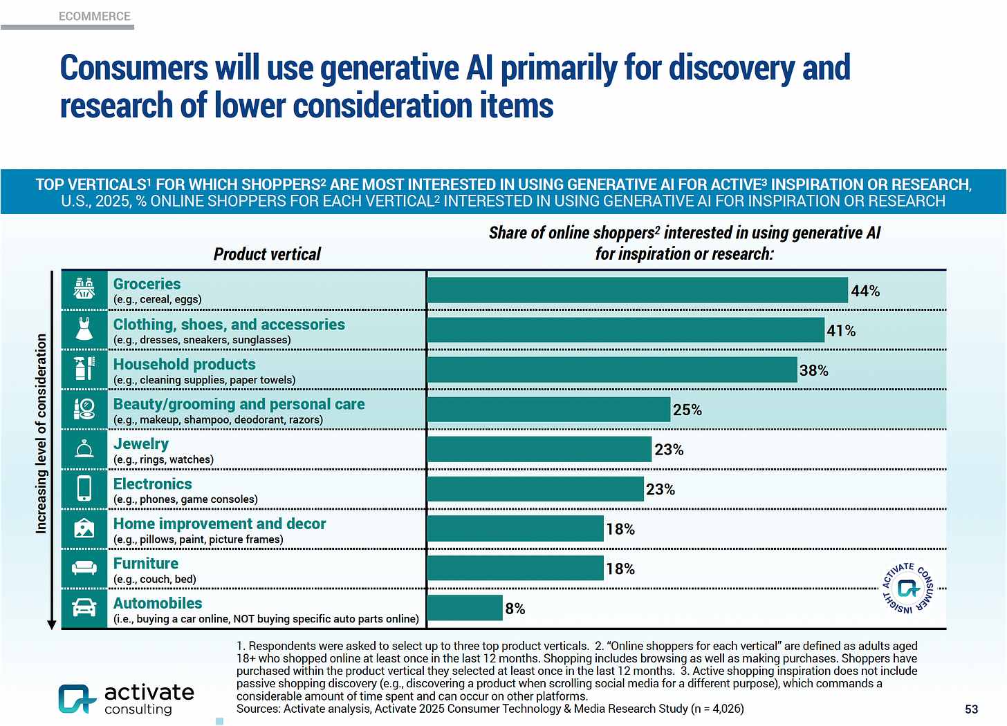 Slide 53: Consumers will use generative AI primarily for discovery and research of lower consideration items