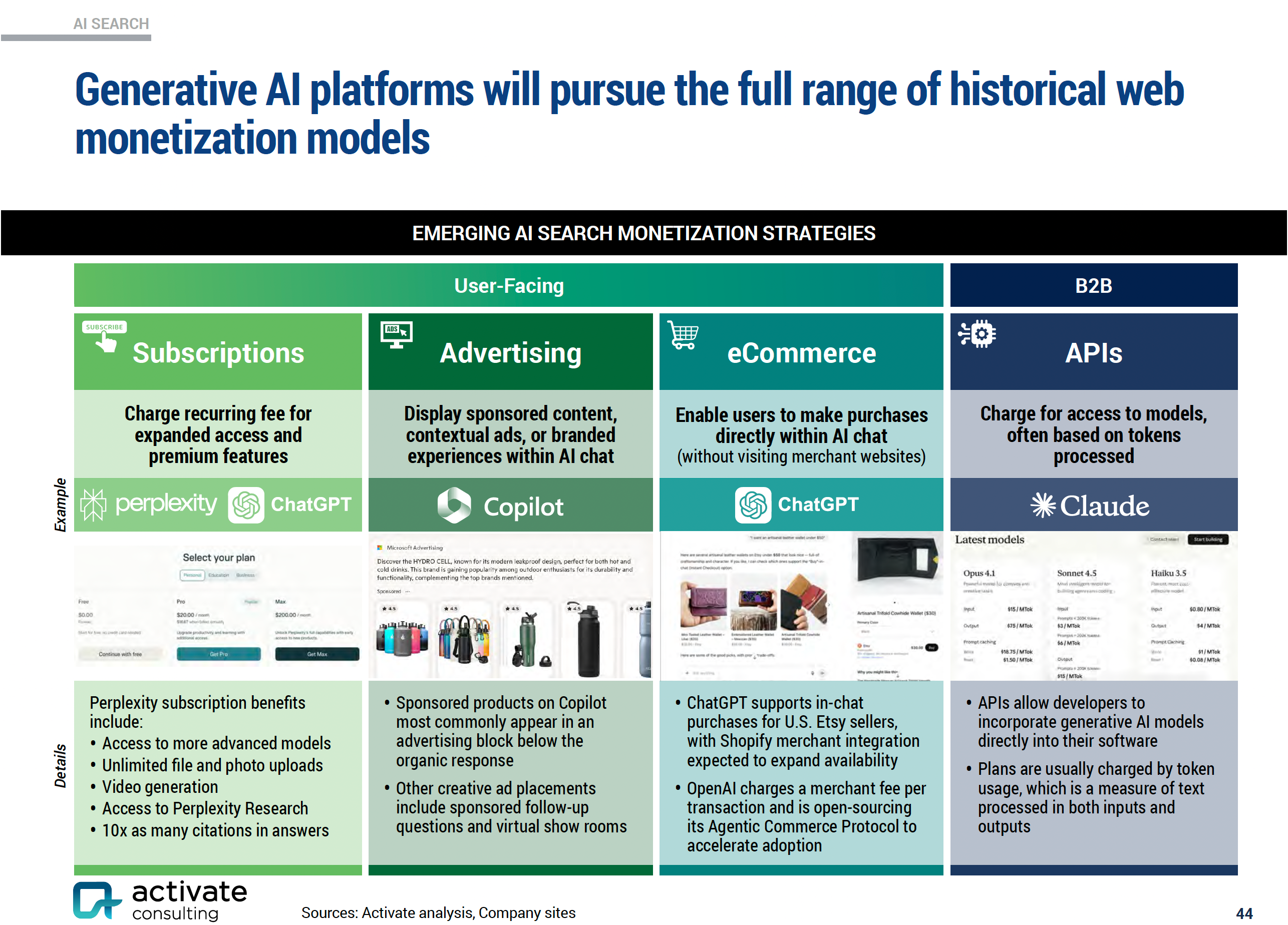 Slide 44: GenAI platforms will pursue the full range of historical web monetization models
