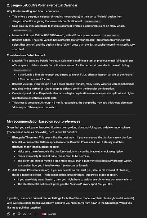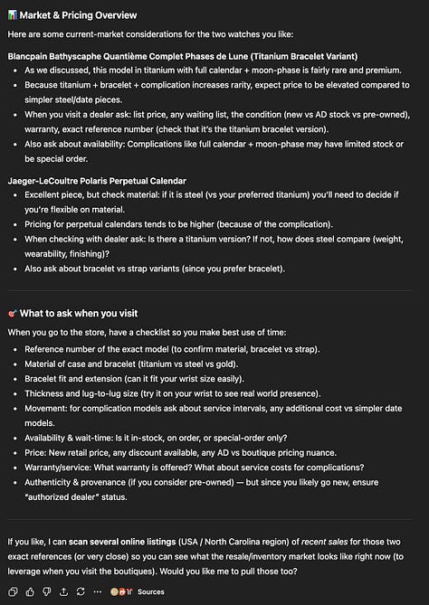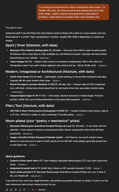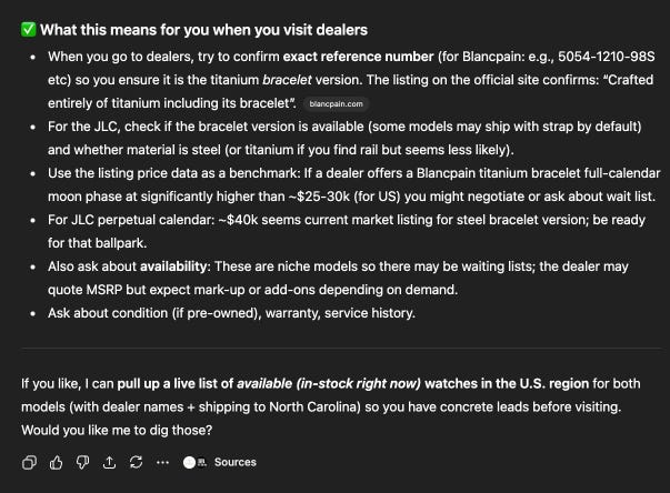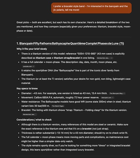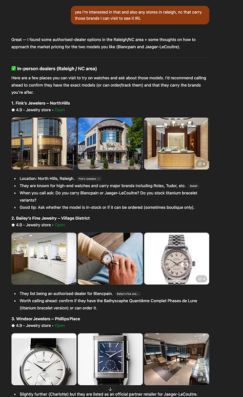 In just 5 prompts I learned more about high-end swiss watches than I could in a store, from Wikipedia or Reddit and even most watch enthusiasts. The Agent (ChatGPT) knew in prompt 2 to ask about some preferences, it took that into consideration - it found stores near me, it found them online so I could research and I’ve quickly narrowed it down to 2-3 models (Find). I’m really digging the Blancpain Bathyscaphe, but definitely want to compare the black face vs. the green, given this is basically like buying a car. And definitely I don’t want an agent throwing this on my card. I want to see it, try it on and ask a human a bunch of questions. Therefore at this point in the journey, I’m parting ways with my agentic buddy who just helped saved me hours and hundreds of tabs from google. Check this out, the agent even conveniently gave me a checklist of what to ask for in the store!