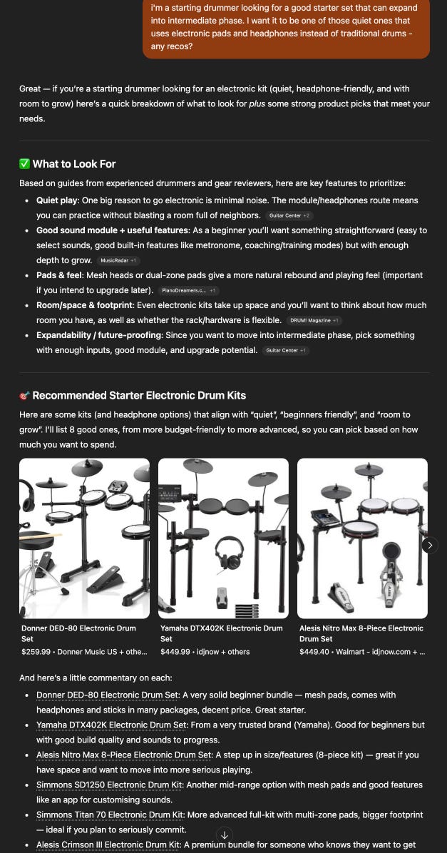 Here’s a Research/Find journey in ChatGPT for a drum set. There is no other way, other than Agentic Commerce to have such a great ‘low consideration /inspiration’ experience IMHO. For the record I know 0 about drum kits as you can tell by my prompt: