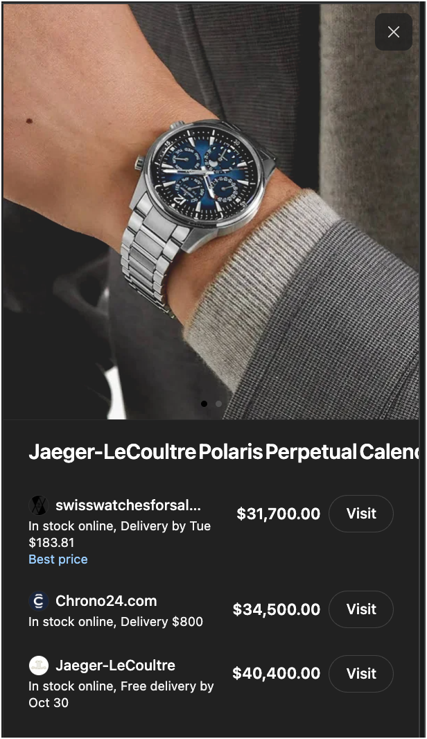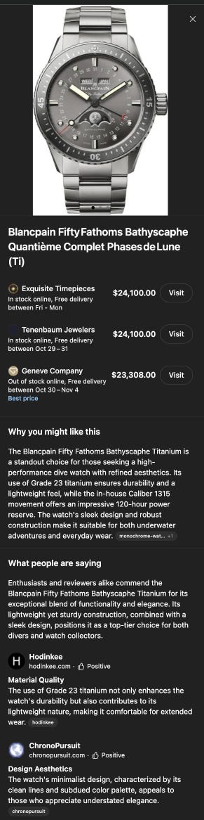 If I were running marketing for Blancpain, I’d want to look at all this and make sure the Answer Engine was right. I’d also want to know what I need to do to beat out that Jaeger. If I was Jaeger, I’d look at their product cards, something is wonky when you see a ~30% price delta→