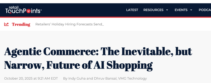 Industry publication Retail TouchPoints brought in two venture folks from VMG Technology, Indy Guha and Dhruv Bansai (both definitely Ninja-level at Agentic Commerce we’ve previously had some fun discussions) to pen a piece: “Agentic Commerce: The Inevitable, but Narrow, Future of AI Shopping.