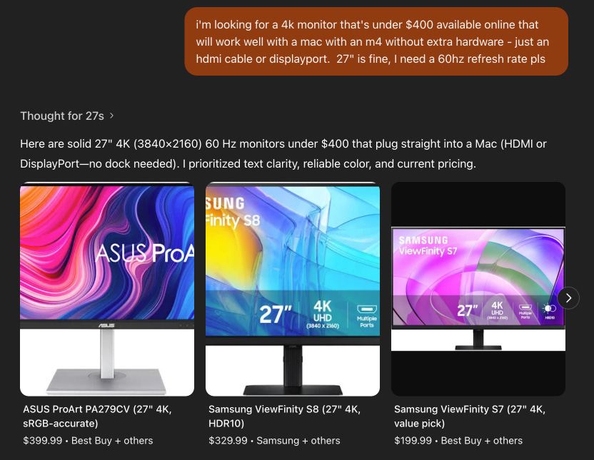 High consideration / Utility - The graphic shows ‘monitors’. Have you shopped for a monitor lately? I have a Mac and finding a monitor is super complicated and the amount of options is overwhelming to the point I’d never buy one without the aid of AI. Have you seen how many choices there are with monitors? In addition to usual price/brand/resolution you have the stand, and hardest to figure out - compatibility. My Mac has one HDMI port (used already), so I need this monitor to be 100% compatible with usb-c/displayport. Guess what? No ecommerce retailer lets you filter on that. I actually need a monitor, so let’s do this!