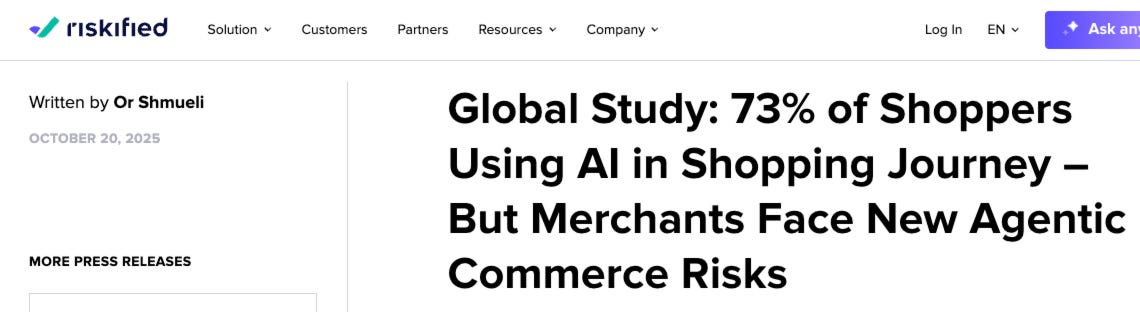 The merchant security company riskified is out with a n=5400 comprehensive survey that unsurprisingly talks a lot about the risks of Agentic Commerce, but they also had some interesting stats: (The survey was completed Sept-Oct 2025, so is ‘fresh’)
