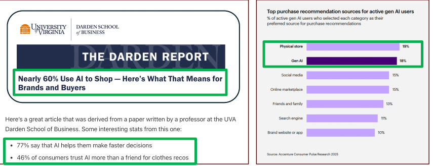 Thursday - In our podcast with Caila Schwartz, she revealed Salesforce’s prediction that 21% of sales in Holiday 2025 will be AI influenced (a staggering $263B) AND that in the first half of 2025, GenAI Answer Engine Search traffic increased a whopping 119% y/y. She also let us know that LLM-generated traffic converts 700% better than social media traffic and 200% better than top converters.
