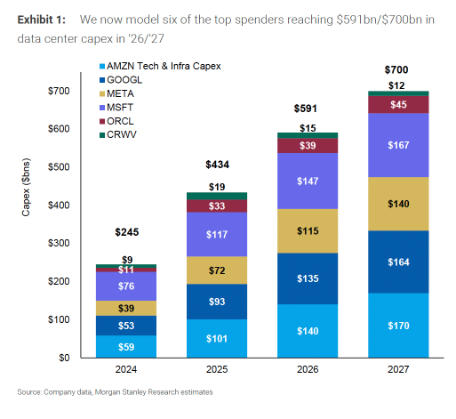 That’s the past, what’s the future look like? When public companies get past Q2 and into Q3, it’s tradition for Wall st. to start modeling out the next year and then from there you have enough trend data to make some educated guesses. In this chart Morgan Stanley took the Q3 actuals which gives us a solid view of 2025, the company’s 2026 guidance/statements and they projected it to 2026 and 2027.