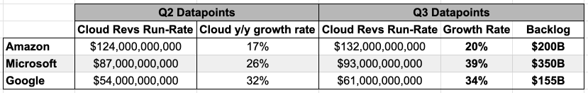You can see the cloud revenue, REAL REVENUE, has accelerated in every case (I think my Microsoft Q2 datapoint is off, grain of salt that one, but google and amazon is solid), and look at the backlogs - this is customers that have signed up, want to go live, but there’s not enough capacity. That backlog between these 3 companies is $700B!
