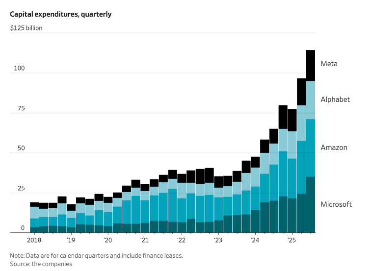 ChatGPT was ‘born’ Q4_22 and you can see one year later in Q4_23 after it improved dramatically with GPT-4, the big four hyper-scalers (Microsoft, Amazon, Alphabet, Meta) went from $35B/Q capex investment which was the level for years to where we are here in Q3 of 2025 at $115B/Q - a 3.3X jump in 2 years and a ~$500B/yr run-rate.