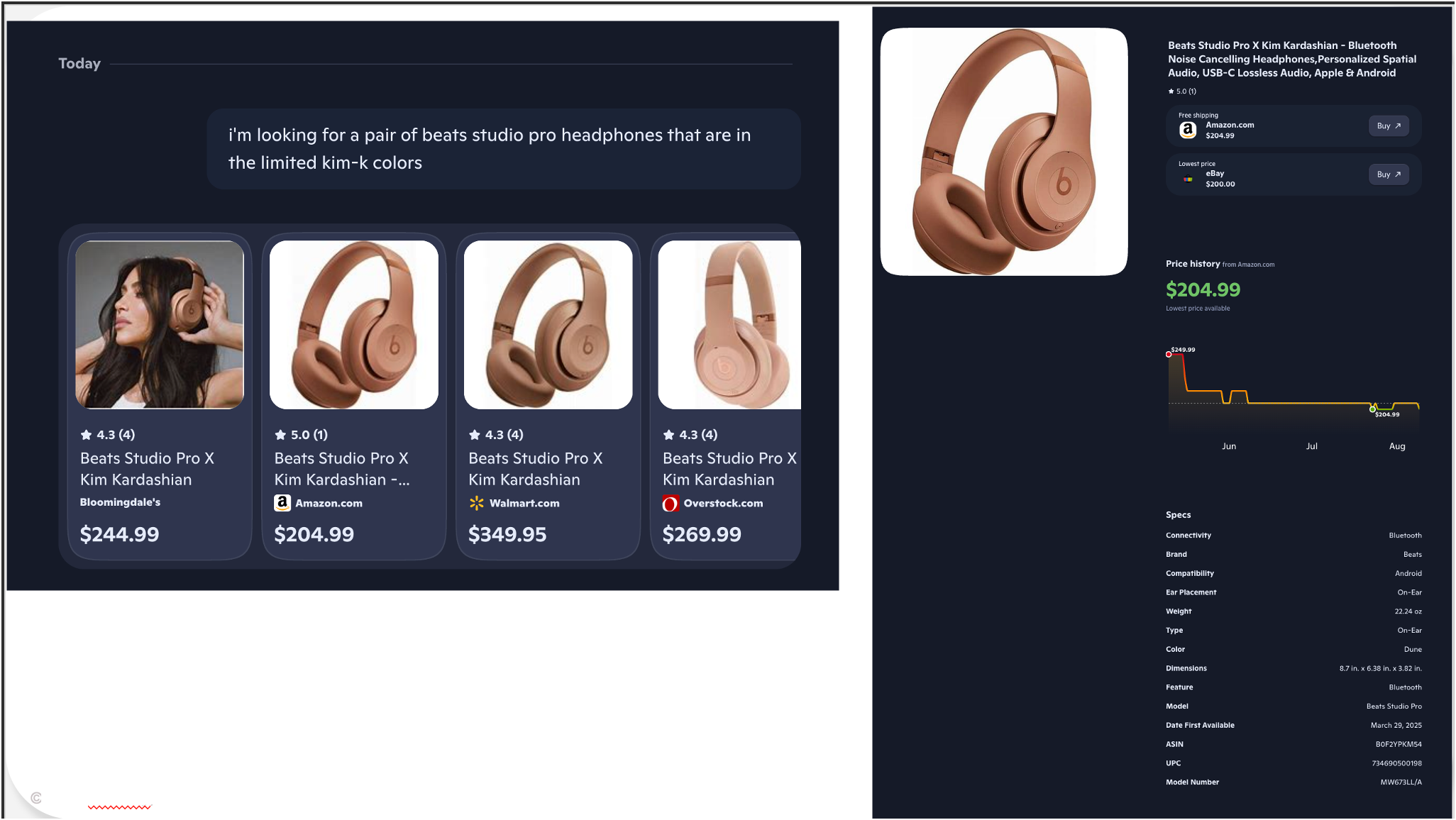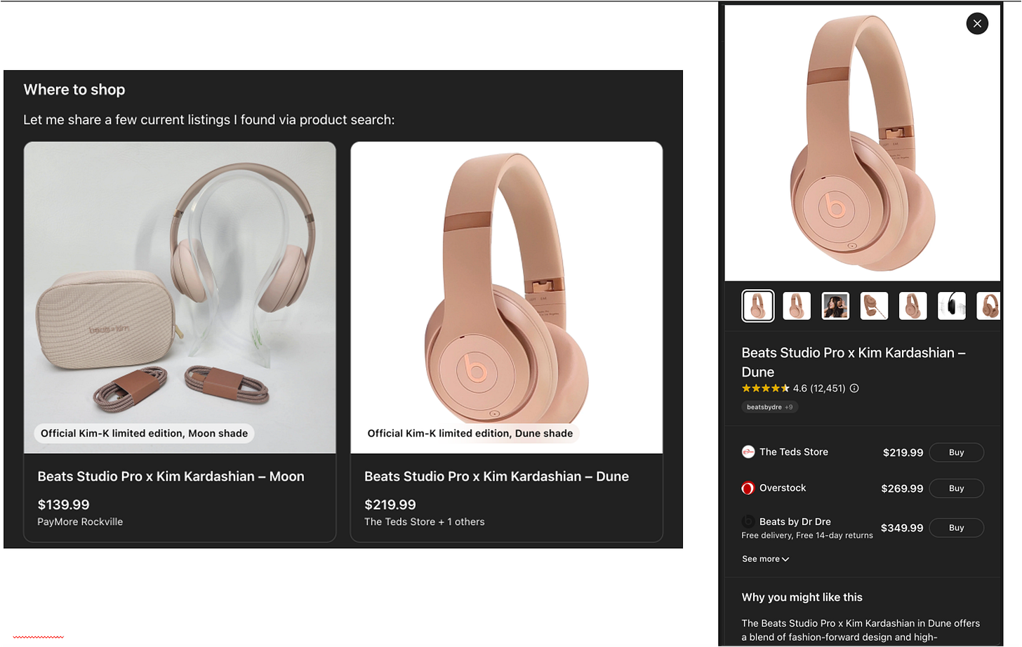 Let’s start by doing a before and after. Here’s the same prompt, same product, compared between ChatGPT-4o and ChatGPT-5 taken less than 3 weeks apart. The prompt is: “I’m looking for a pair of beats studio pro that are in the limited kim-k color”