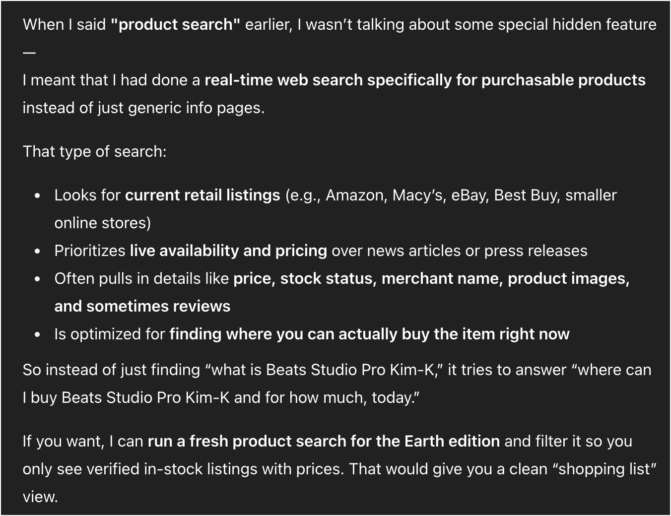 What ChatGPT’s telling me in its answer is that either the system prompt or an internal tool, or a reasoning model (less likely) has told it to take my query and format it to that ‘where can I buy Beats Studio Pro Kim-K and for how much, today.”