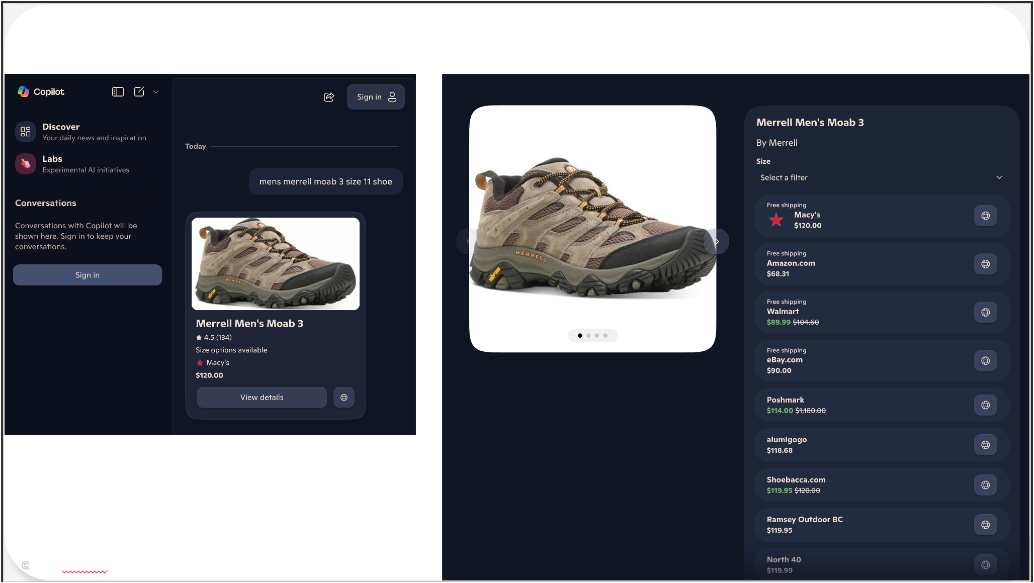 Here the product card experience hasn’t changed much, but what I wanted to highlight is the product offers pop-up page. Note that Copilot adds a cool price trend chart and also all the attributes it knows about the product.