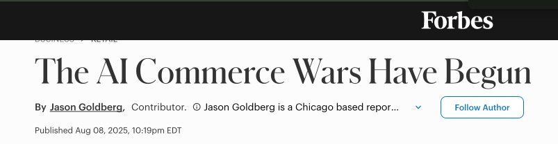 Turns out that Jason Goldberg, aka RetailGeek, is not only the Chief Commerce Strategy Officer at Publicis and World-famous celebrity podcaster, but he also is a Contributor to Forbes and this week he had a great piece out laying the background of where we’ve come so far in Agentic commerce in such a short time.