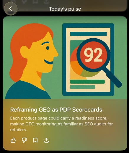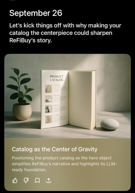 This first Pulse Card was quite a surprise, I was expecting weather or something kind of light and fluffy and here Pulse is hitting me with some ideas on how to position my startup and suggests we punch up on “Catalog as the Center of Gravity”. This is 🤯 because while I’ve brainstormed some things with ChatGPT about press releases and some ideas around wording, I didn’t realized it had pulled together such a deep understanding. I won’t show you behind the card, because, well it’s ideas are really really good and insightful.