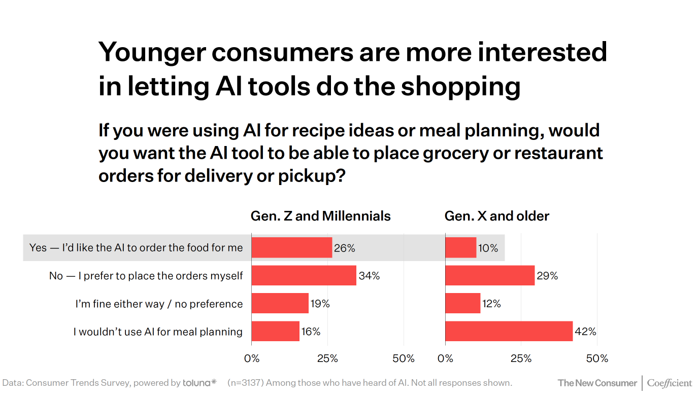 While the topic is tied to meal planning and grocery, I think it’s as good a proxy as we’re going to get. As with any new technology, the younger generations are faster to adopt it and trust it and then the older generations come along. Not surprising but good to have a baseline here in Fall of 2025 to track how fast these cohorts pull together in behavior.