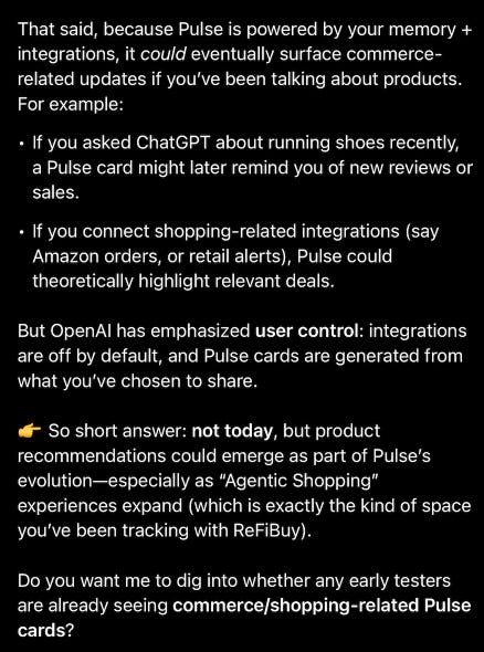One Pulse Card I hoped to see was something around products. As you can imagine I search for a ton of products on ChatGPT on any given day, but there aren’t any Pulse Product Cards in my feed. I asked ChatGPT about it and it said, not today, but…