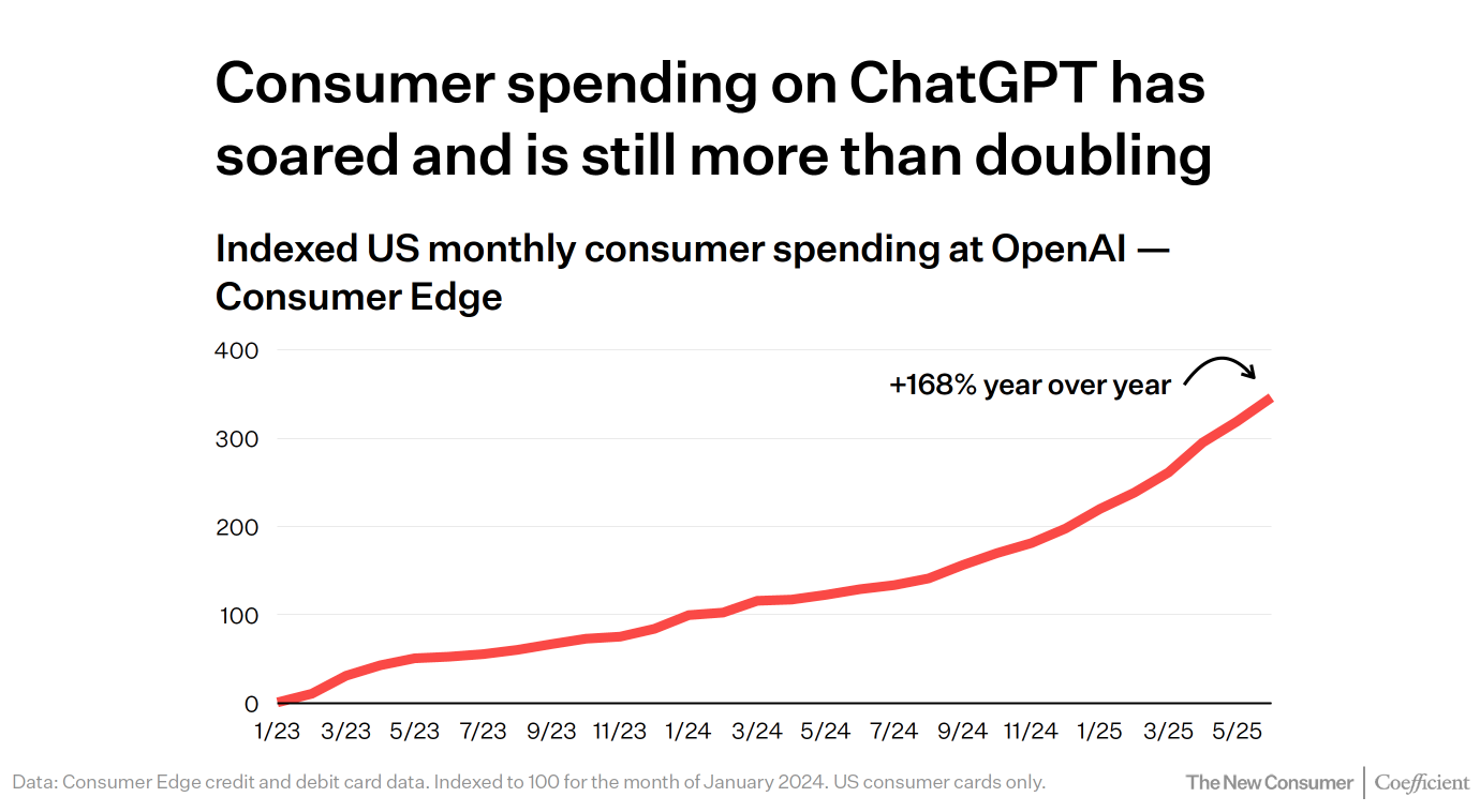 Digging into ChatGPT, Dan has access to credit card receipt data that shows how many US consumers are paying for ChatGPT. This is growing 168% y/y. The ChatGPT freemium model is cooking 🧑🍳. Consumers try the free version, love the experience, but hit prompt limits, or want access to better models and features and pull out their credit cards 💵