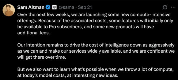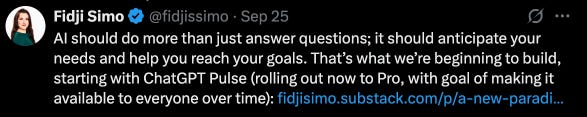 Long-time readers will know what I was thinking (ChatGPT Checkout!?), but alas, instead we saw the birth of ChatGPT Pulse, which was also saw Fidji Simo’s first X post (and a new-to-me substack to go along!) announcing a big new consumer feature for ChatGPT in her new role as CEO of Applications:
