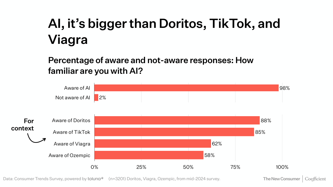 At the top of the funnel, GenAI has 98% awareness. You can’t really get too much better than that. Dan points out that GenAI’s awareness is greater than top brands like Doritos, TikTok and Viagra: