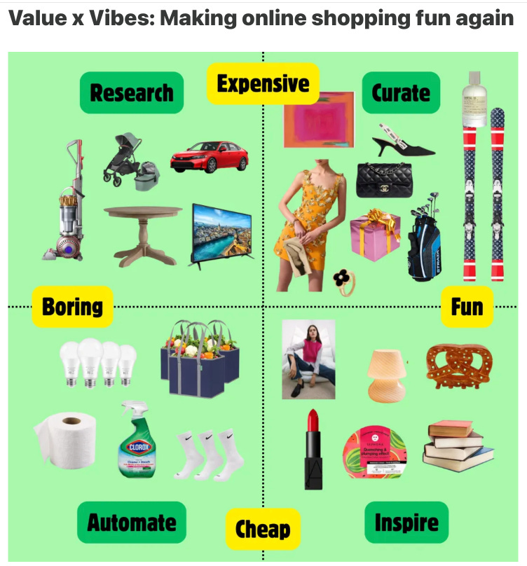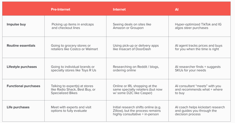 , introduced us to her ‘Value x Vibes’ frameworkIn the same vein, In this awesome post from A16Z, Justine Moore and Alex Rampell think through the amount of consideration the shopper makes for a purchase from low (impulse buy) to high (life purchases). They then matrix that across the pre-internet ‘analog era’ to ecommerce 1.0 to Agentic and give us another framework.
