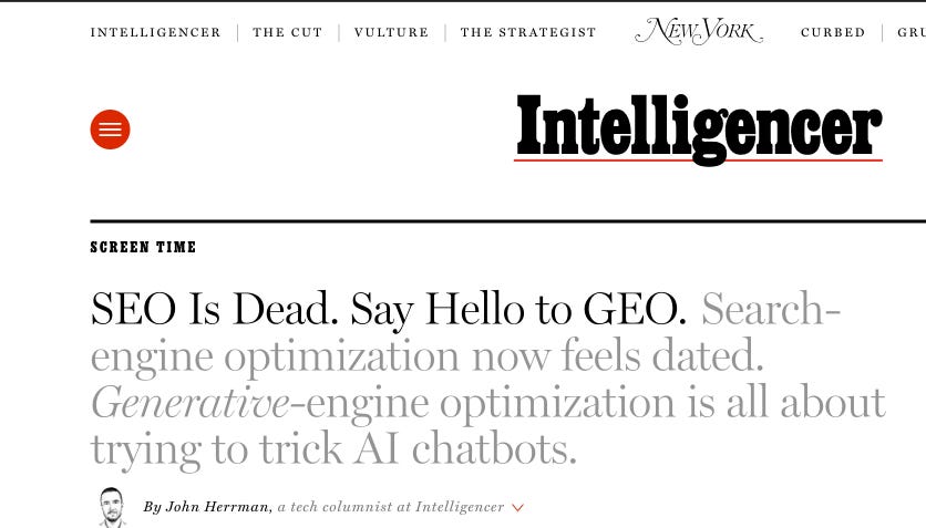 Like Entrepreneur, this NY Mag piece, has less of a consumer orientation, but also chooses to introduce the concept of Agentic Shopping via GEO and how it ‘tricks AI chatbots’.