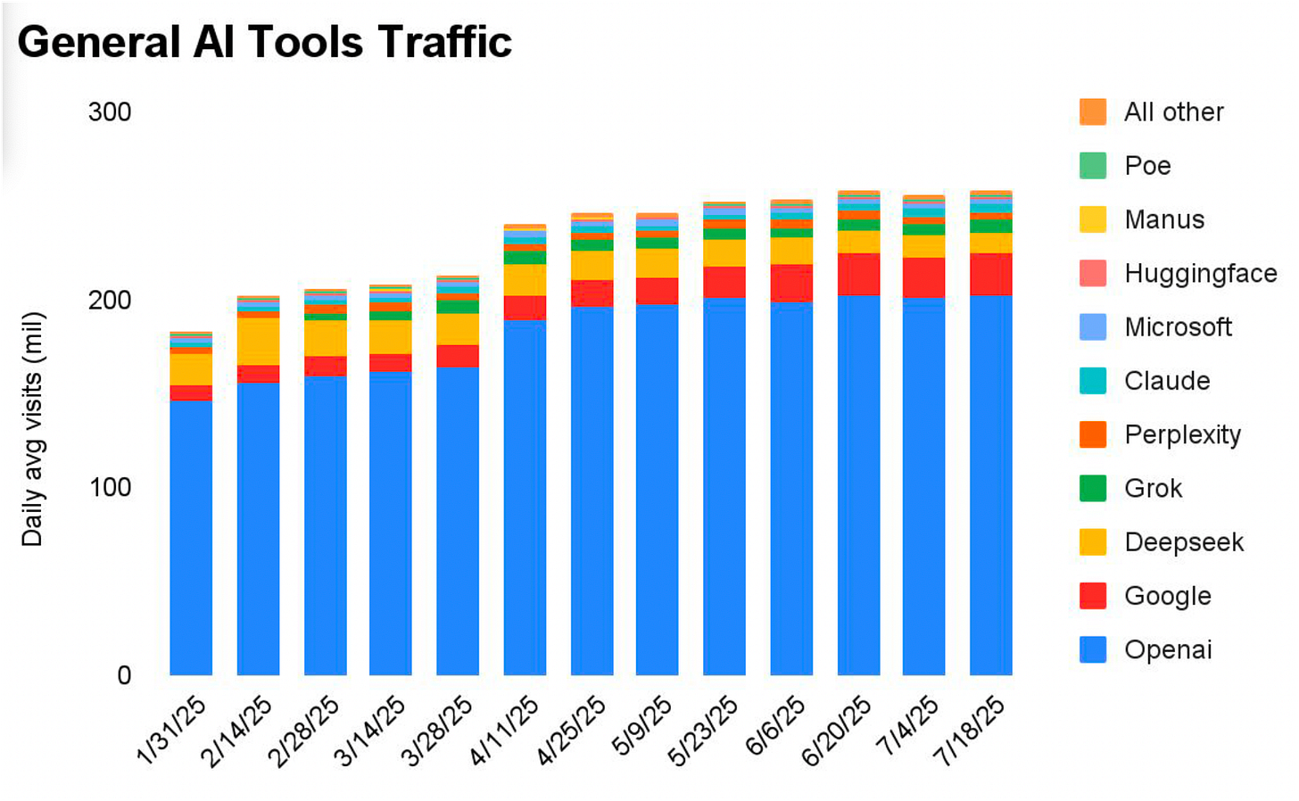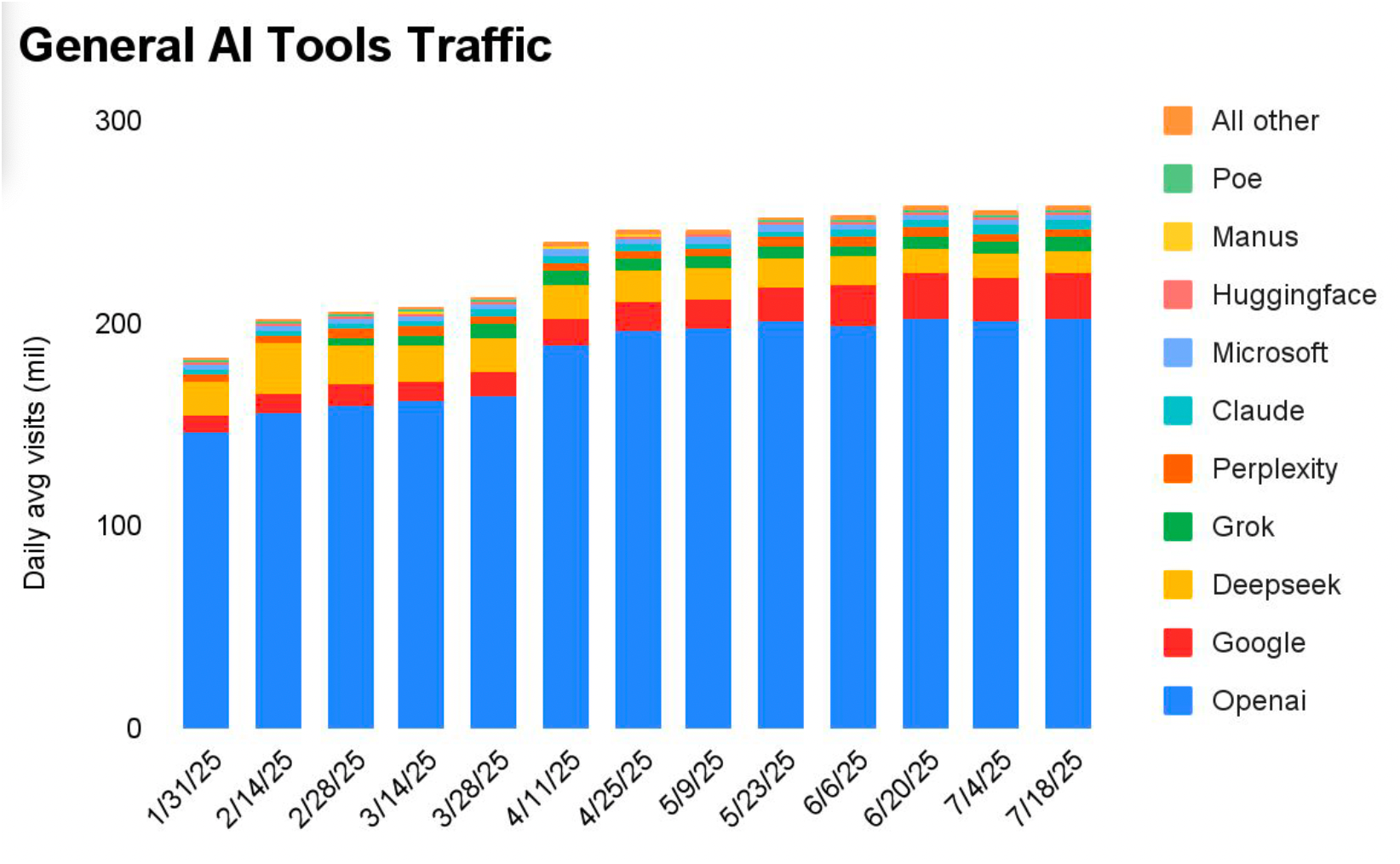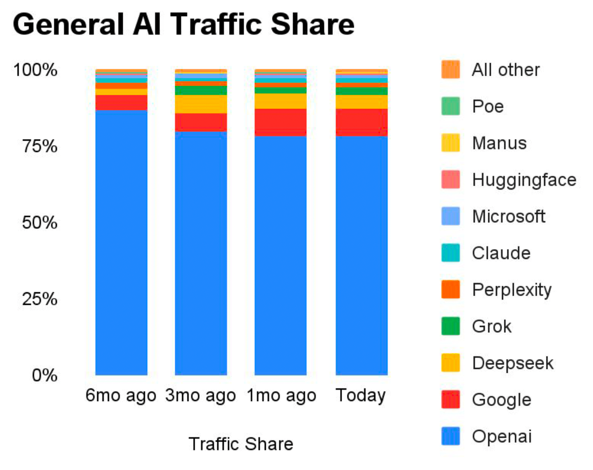 In this view, ChatGPT is losing a little bit of share, primarily to Google, but then you see Deepseek, Grok, Perplexity, Microsoft and Claude together taking share. Eyeballing it, it looks like ChatGPT has gone from 86% to 75%. It will be interesting to see if ChatGPT-5 can give it a boost.