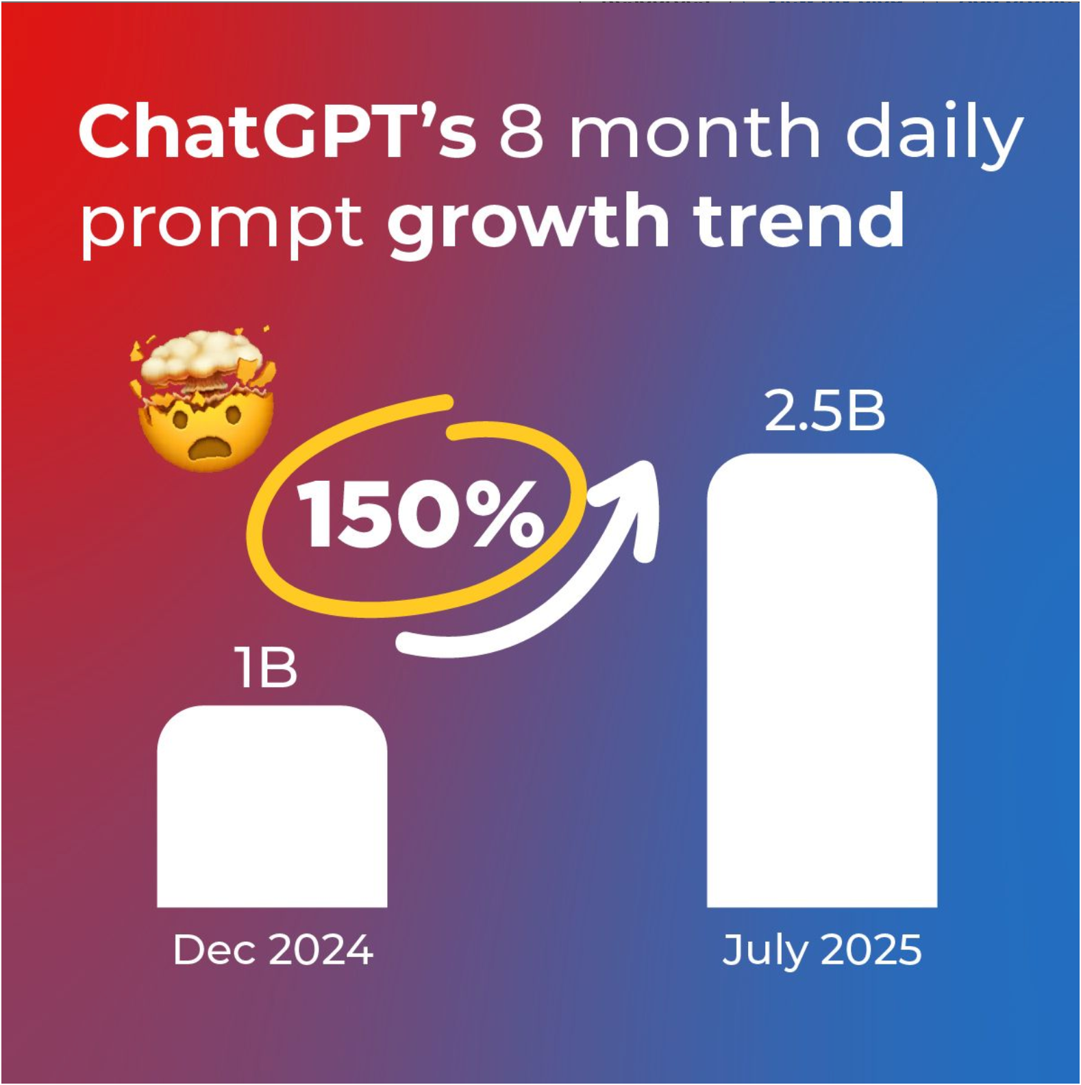 First, he told Axios that ChatGPT is now processing 2.5B prompts/day. The last datapoint was in December 2024 and was 1B: