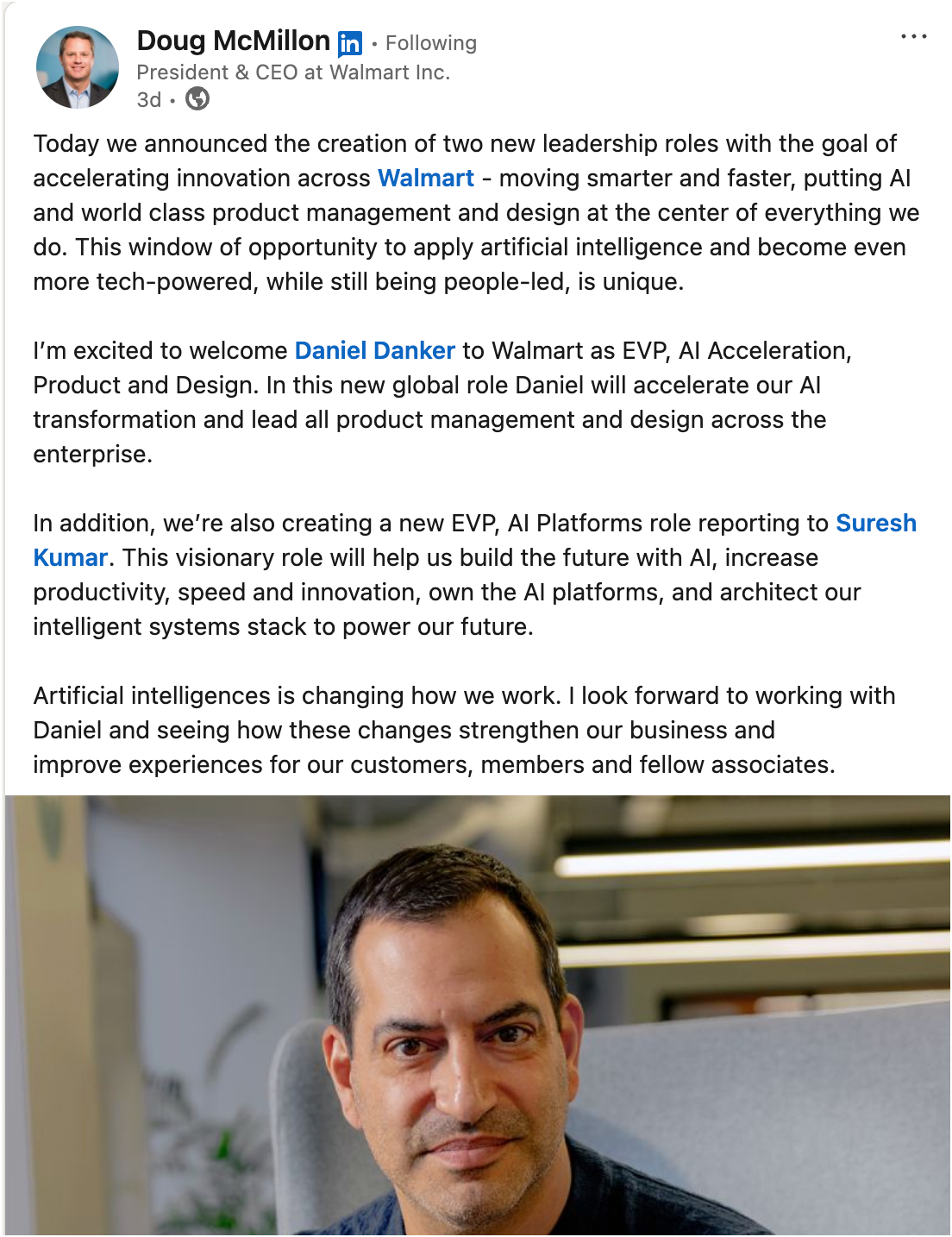 Walmart CEO, Doug McMillan, announced on LinkedIn that they have hired Daniel Danker, formerly Chief Product Officer at Instacart, to be EVP of AI Acceleration at Walmart.