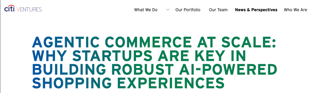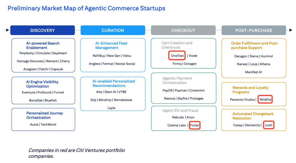 The team at Citi Ventures has an article out this week walking through the background/trends that ‘setup up’ Agentic Commerce and then the introduced the first Market Map of the startups in the space that I’ve seen:
