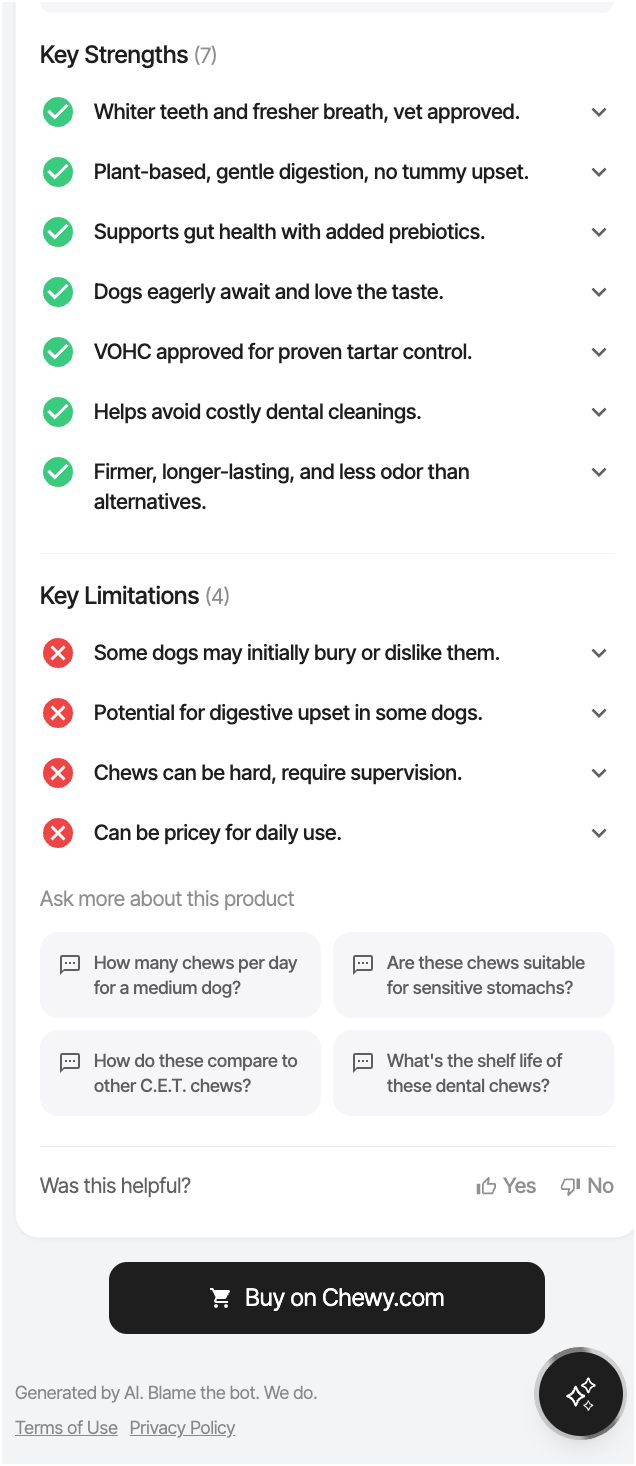I took a Chewy URL for the VeggieDents my dogs like. It’s a great example case for Agent shopping because it has some complexity to it. It has variations and there are several products by the same company that are different (not chews) but for agents that use Google shopping and other existing pre-agentic systems that do poorly with complexity, it causes problems.