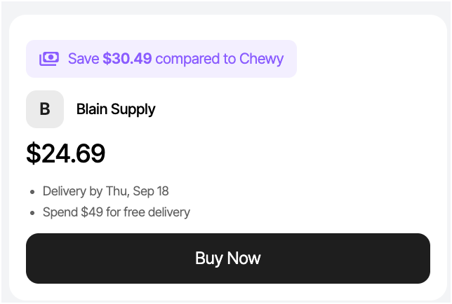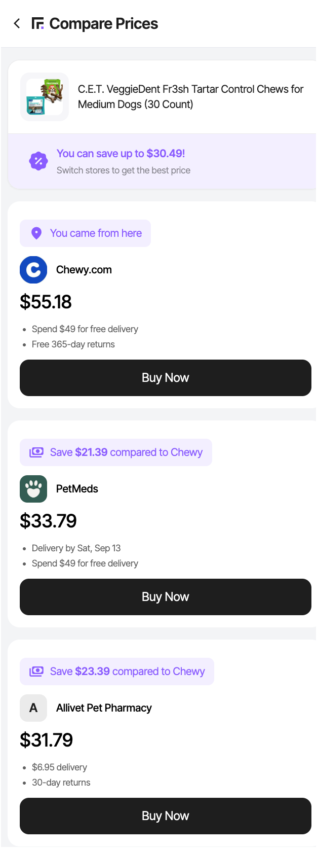 At the top, there’s a price/finder in the top section. It immediately shows some good savings where Chewy is $55.18 and PetMeds is $33.79 on this SKU with 19 more.
