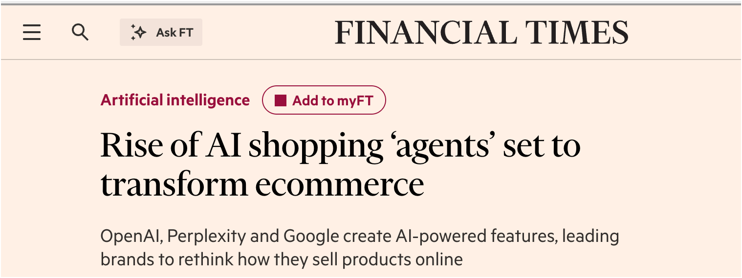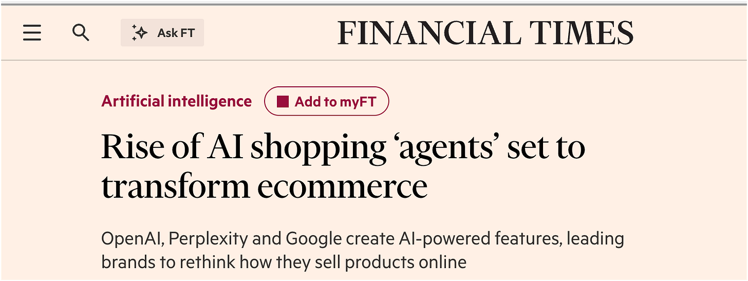 The Financial Times is at it again. They crashed onto the Agentic Commerce scene with their SCOOP covering the leak of ChatGPT’s forthcoming checkout. This week they had a piece that, like the Citi Ventures piece, has a good overview of the latest Agentic Commerce news (that you were way ahead on because you read Retailgentic) and some quotes from industry players. The article is here, but paywalled.