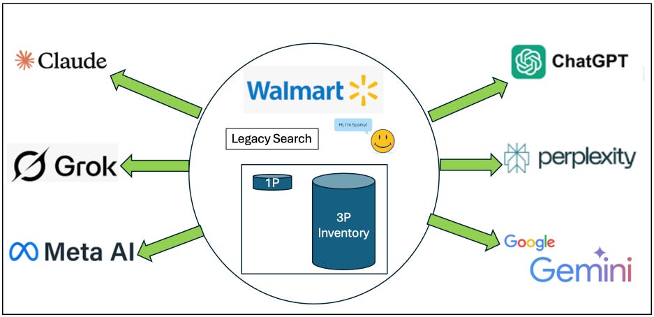 Walmart has thrown open the virtual doors for crawlers, ACP and UCP to come and get their inventory and bring in new customers. Walmart is betting that customers shopping via the Agentic Commerce âAnswerâ Engines are incrementally new customers, and, maybe even Amazonâs customers. Whatâs even better, is Walmartâs 3P merchants come along for the ride, giving them even more exposure and opportunities to sell with zero effort.
