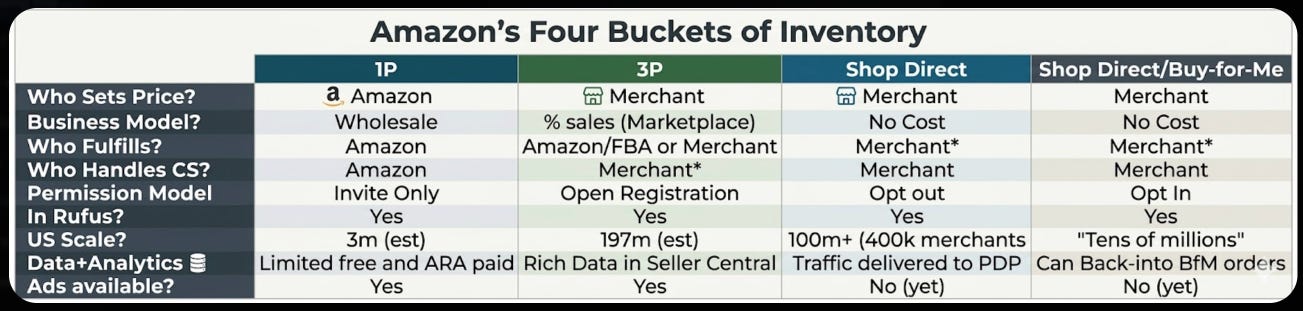 Iâve been working with Amazon (as a partner) since before they had a marketplace and for those of us that lived through all of this - where we are today makes sense. But Iâve noticed one of the TOP FAQs when I meet Retailgentic readers/merchants at tradeshows is a lot of questions about the differences between 1P, 3p, Shop Direct and Buy-for-Me. Hereâs my attempt to try and add clarity there for everyone.