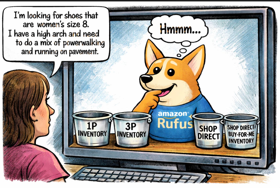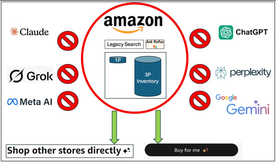 Last thought before we get to the news. Amazon, being Amazon and given their âking of the hillâ position in ecommerce, has a unique strategy for Agentic Commerce that is also one of my TOP FAQs when I meet people, because it can be perplexing if you donât see their point. Iâve found itâs helpful to compare to Walmart visually to help understand: