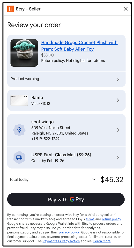 When I click Buy, I am now in a single pane checkout experience. It’s quite robust and well done, I can change the credit card in-flow (the OG ‘Buy for Me’ experience pushed you to Gpay and back which was clunky at best).
