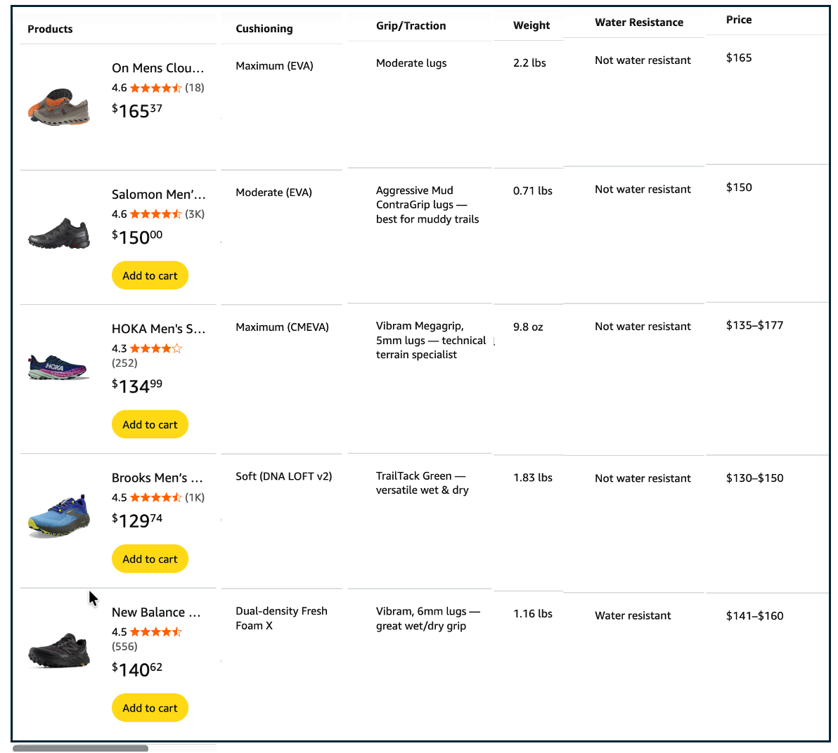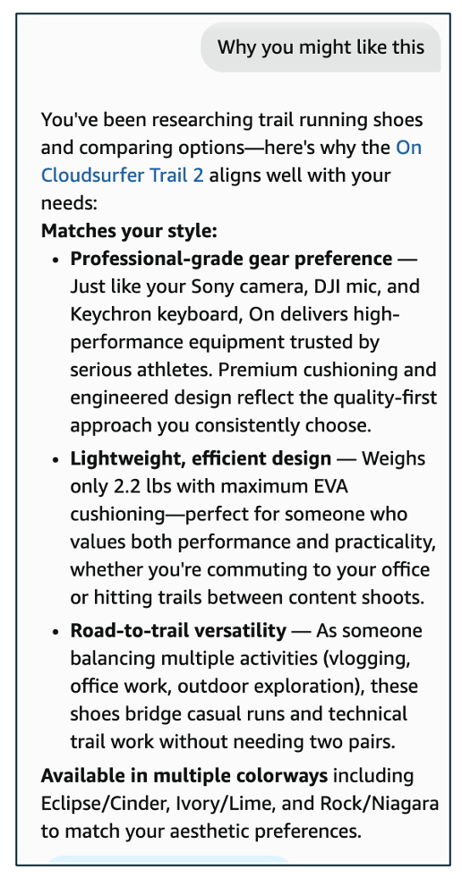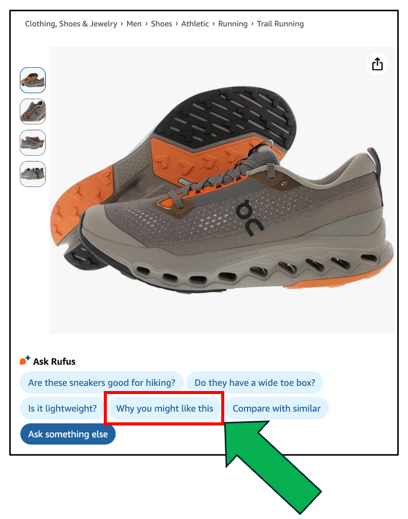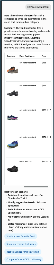 On many PDPs under the hero image where there have historically been Rufus Prompt Pills, you will now see a ‘compare similar’ prompt pill. You can also manually ask this at any time. Here it is for some On shoes: