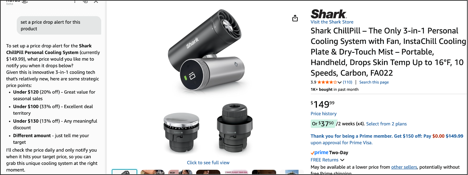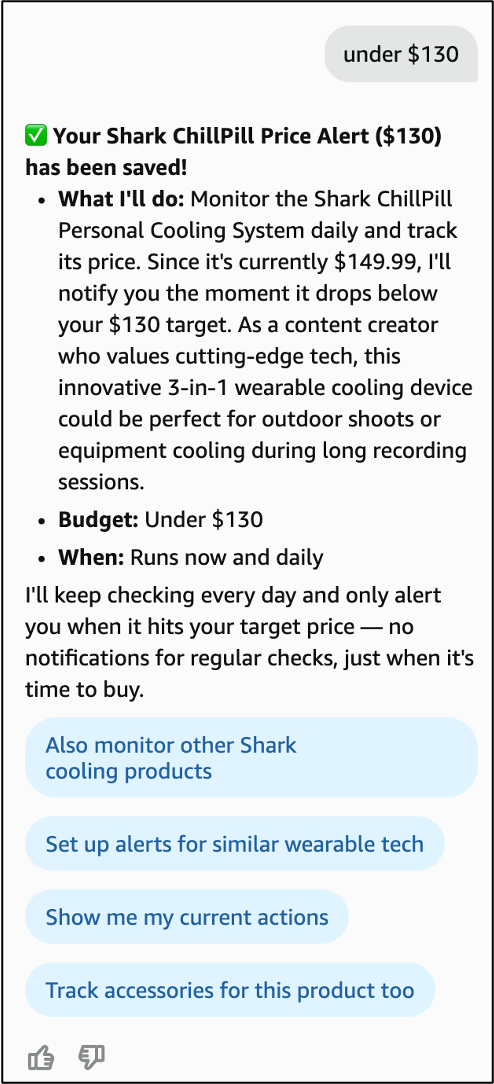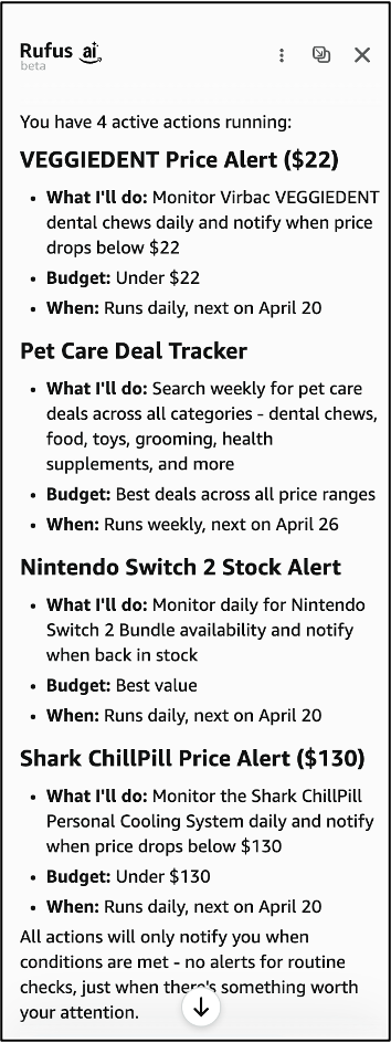 Finally, I had it set an alert for my Veggiedent’s to be on sale at their lowest price and an overall weekly deal tracker. Now when I say “show me my current actions” Rufus will help me manage my list: