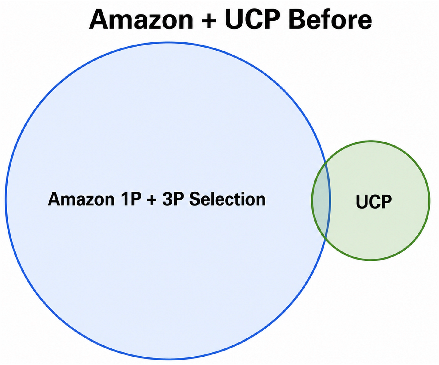 Up until today, if you wanted to get to the selection that isn’t in Amazon, you would have to visit hundreds to thousands of websites or use the non-transactional Google Shopping which isn’t really a ‘transactional’ threat. ACP and UCP threatens to challenge that. What if you can now find all of the stuff ‘not on Amazon’ in one location. What if the economics are so good, Amazon starts to bleed 3P sellers? That’s a threat worth keeping an eye on and looking the opportunity to embrace and extend to neuter the threat. Here’s a Venn diagram visualization: