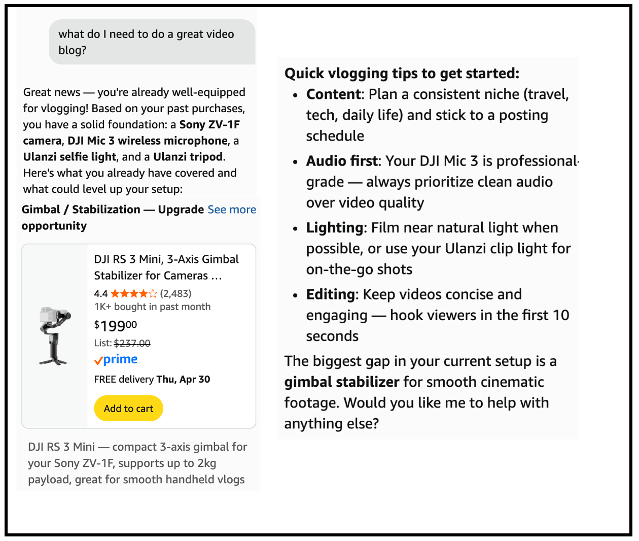 You can use Rufus to deep dive into topics you’re interested in. Ask Amazon any high level question about doing something and it will now piece together the products you need, punch out things you already have from your history and give you a detailed plan for how to use that plus anything new. Here’s an example where I asked Rufus hypothetically what I would need for a video blog: (edited for brevity and to save space).
