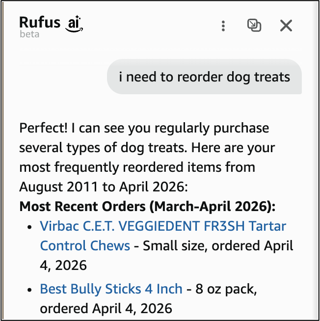 You can be specific or general such as: reorder dog treats or “reorder everything I used to make pecan pie” and Rufus will load your cart up for you.