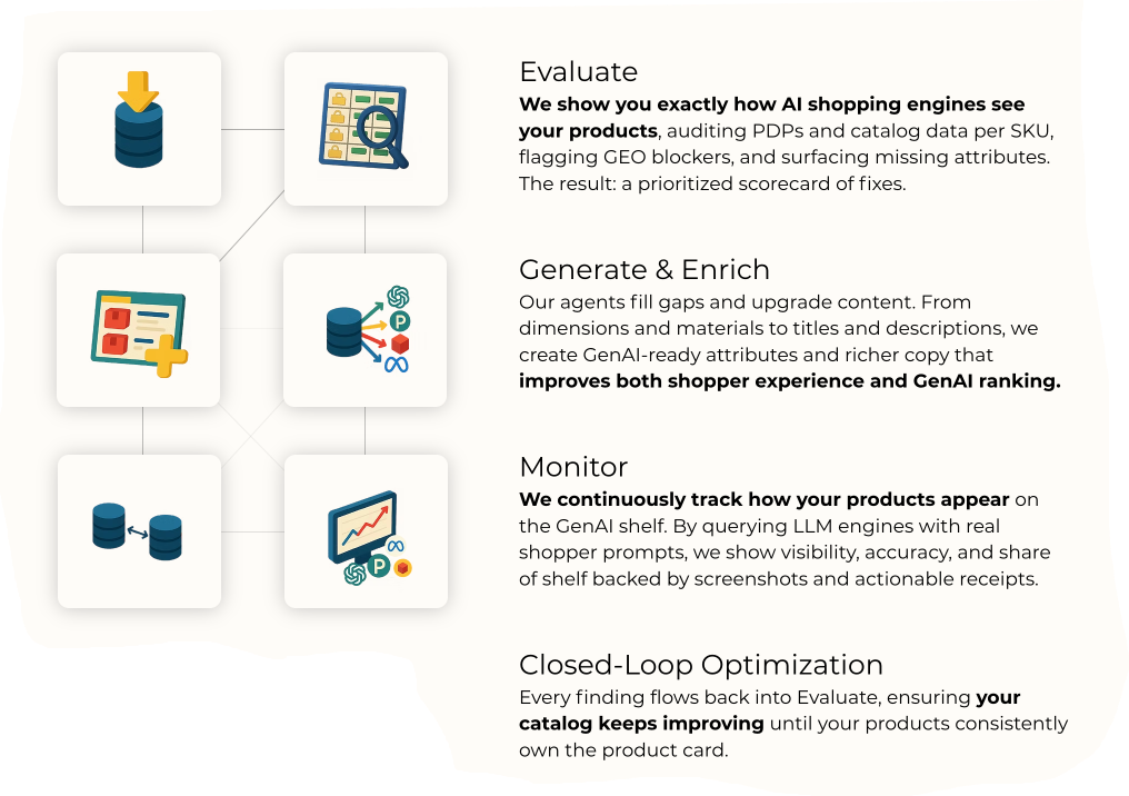 The system is built for retailers, brands and the agencies that support them as they sell online. Our goal is to help them prepare for and optimize for Agentic Shopping Engines (ChatGPT, Perplexity, Copilot, Gemini, Meta.ai, Anthropic/Claude, Xai/Grok) which are growing rapidly in popularity with consumers.