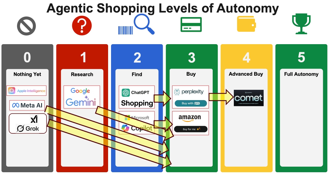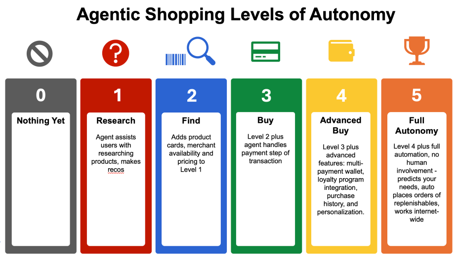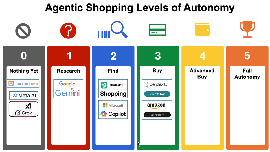 Those are the players, but how do we track their status? With the 5 Levels of Agentic Shopping Autonomy: